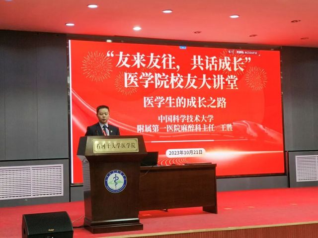 2023年10月21日下午,“友来友往,共话成长”医学院校友大讲堂在石河子大学医学院学术报告厅圆满结束。此次讲座有幸邀请到曾经的石河子大学医学院老师、石大一附院医生,现任中国科学技术大学第一附属医院麻醉科主任、博士研究生导师——王胜教授,王老师用自己从专科走向博士的经历,向大家讲述了医学生成长之路。