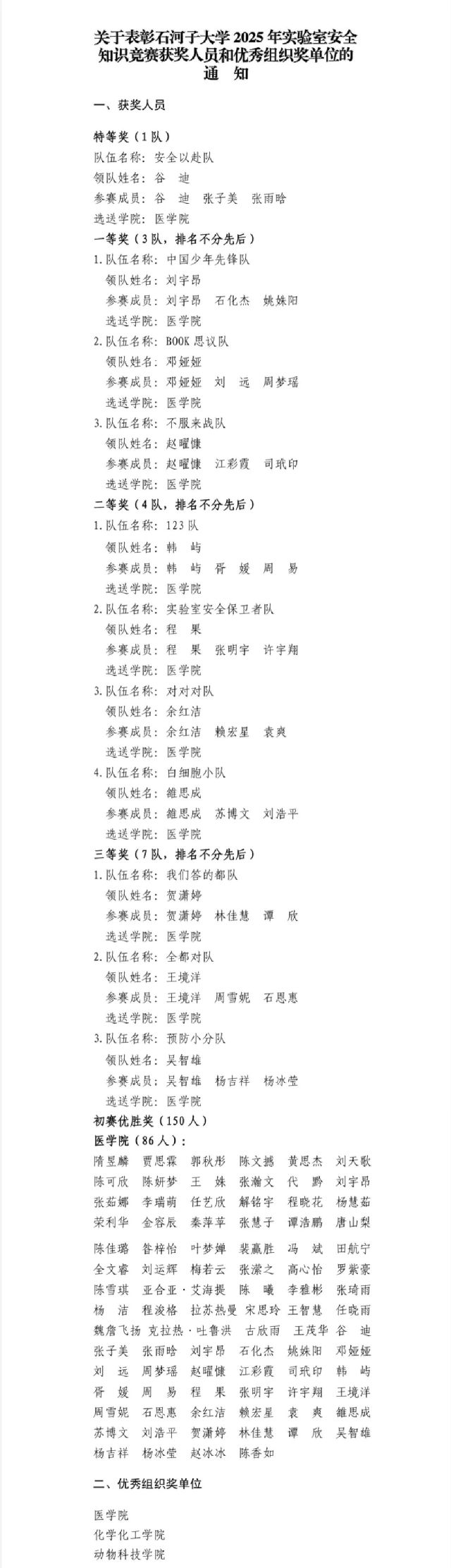 为深化实验室安全意识,筑牢校园安全防线,石河子大学于2025年6月22日举办“2025年实验室安全知识竞赛”。在此次竞赛中,医学院共223名学子参加,包揽特等奖、一等奖、二等奖等多个奖项,学院荣获“优秀组织奖”,参赛规模与质量均居全校首位,彰显了医学院在安全教育和实践能力培养方面的卓越成效。