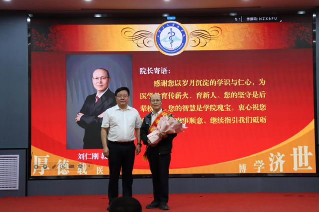 第二环节“岁月如歌,荣光绽放”由医学院工会副主席郅洁老师主持。生理教研室刘政江教授作为退休教师代表,深情回顾了自己数十载的执教生涯,言语中充满了对学院的深厚情感与对后辈的殷切嘱托。学生代表随后上台,用真挚的语言表达了对恩师们无私奉献的感激与不舍,并送上全体学子最美好的祝福。新进教师们手捧鲜花,向为学院发展倾注毕生心血的前辈们致以最崇高的敬意。李浩老师一曲深情动人的《老师,我总是想起你》,更是将现场的感恩与惜别之情推向高潮。随后马克涛院长代表学院向所有荣休教师致感谢辞,高度赞扬了他们立德树人、潜心治学的卓越贡献,并祝愿他们退休生活幸福安康。
