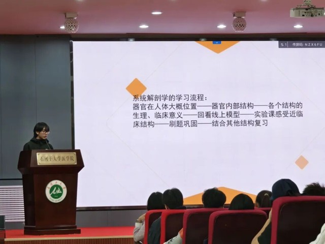 2025年9月28日15时30分,石河子大学医学院“学业筑基,优生领航”学习经验分享讲座在南区学术报告厅如期启幕。讲座邀请唐凯、袁淇榕、郭璐涵、吕子洋四位学生围绕系统解剖学、组织胚胎学、细胞生物学三门核心学科,结合自身经验分享学习心得,为在场130余名同学带来针对性指导。