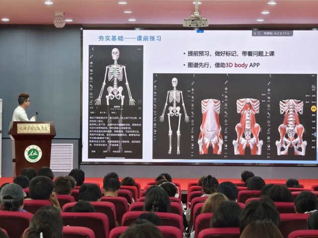 临床医学专业的袁淇榕同学则依托大屏幕展示的“系统解剖学学习流程”,层层拆解从“器官宏观定位”到“微观结构解析”,再到“临床意义延伸”的完整逻辑链;他还特别推荐借助3Dbody APP辅助实验课学习,以数字化工具突破传统学习的空间局限,助力同学们构建更立体的解剖学认知体系。