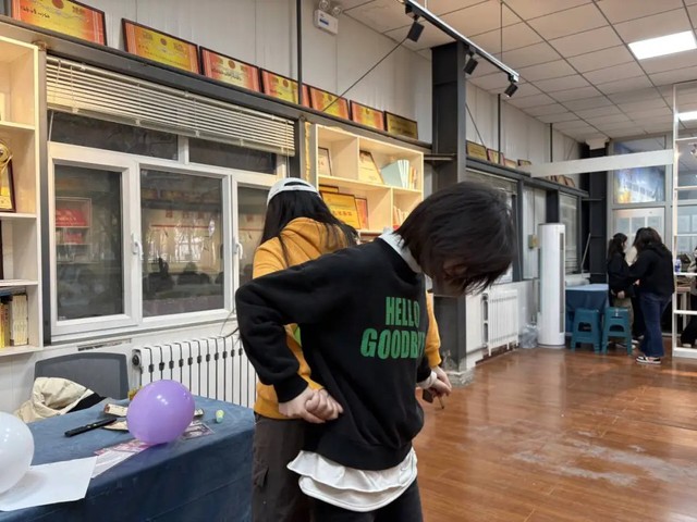 “以体强心·能量唤醒”站,两位同学背靠背站立,将气球置于中间,以最快速度将轻盈的气球一个个护送至终点。在这场充满欢笑的挑战里,身体被充分激活,心灵也随之轻盈飞翔,两颗有力的心脏在此刻产生共鸣。在这场游戏中,同学们不仅锻炼了身体,更在互动中学会了坚持与鼓励,感受到了并肩作战的温暖与力量。