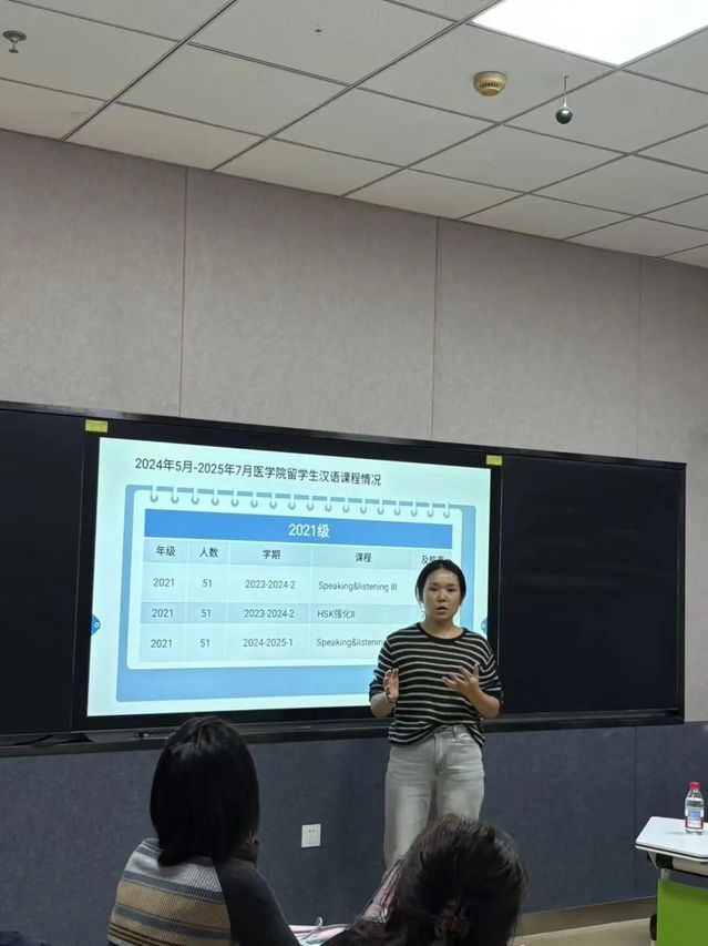 随后,留学生办公室奇格汗老师汇报了2024年5月汉语教学改革实施以来的整体情况及HSK4考试通过成效。通过梳理各年级汉语课程学习数据,奇格汗老师指出,小班制授课模式已显著提升了汉语教学针对性和学习效果,但如何进一步增强学生的汉语学习兴趣、挖掘自主学习潜力,仍是当前汉语教学需要重点突破的问题。