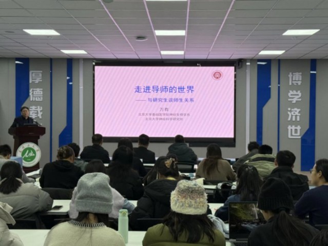 12月7日上午,医学院基础医学博士研究生《生命科学进展》课程在杏三324举行。本次课程特邀国务院学位委员会基础医学学科评议组成员兼召集人、教育部与国家卫生健康委员会神经科学重点实验室主任、北京大学神经科学研究所所长万有教授,为学院师生带来题为“走进导师的世界——与研究生谈师生关系”的专题讲座。讲座旨在搭建师生间深度沟通的桥梁,消除隔阂与误解,引导研究生与导师共同探索学术道路上协作共进的艺术。医学院、公共卫生学院党委书记张青、医学院院长马克涛、副院长王良海参加本次讲座,讲座还吸引了各学位点青年导师及研究生到场聆听。