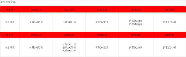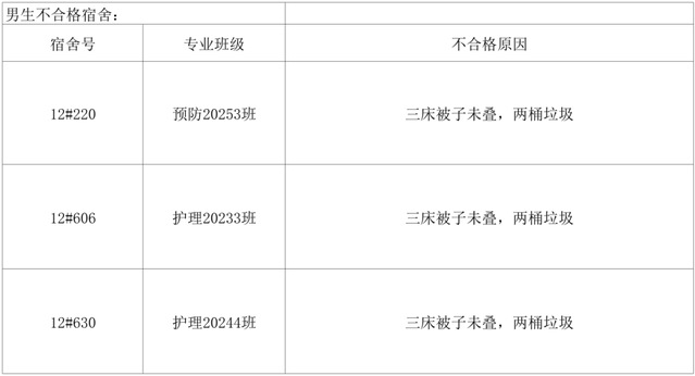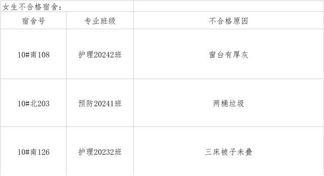 宿舍是学生在校期间学习、生活的重要场所,是培育良好习惯、增进同窗情谊的重要空间,整洁文明的宿舍环境对学生成长发展具有积极的滋养作用。为进一步优化宿舍生活氛围,落实“以生为本”的服务管理理念,医学院宿舍管理委员会于第十周组织开展了全体本科生宿舍卫生检查工作,通过现场检查、规范指导、意见反馈等方式,推动宿舍环境建设提质增效。本次检查结果显示,各宿舍整体卫生状况良好,多数宿舍能够做到物品摆放有序、窗台洁净、桌面地面整洁无杂物。现将检查结果公示如下: