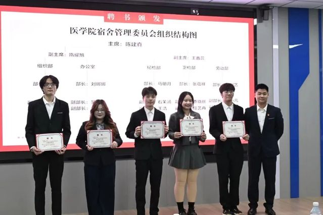 为全面总结宿舍管理委员会过往一学期的工作成果,表彰在宿舍建设中表现突出的先进集体,顺利完成新一届宿管会成员的换届聘任工作,进一步强化宿舍管理服务效能,12月11日晚20:30石河子大学医学院宿管会换届暨表彰大会在南区杏三A324会议室隆重召开。本次大会由医学院秦瑜涵同学全程主持,医学院学生办公室主任朱伟娟老师,以及王海楠、张志英、刘蒙恩老师受邀出席,与宿管会全体成员、各年级宿舍代表共同见证这一重要时刻。