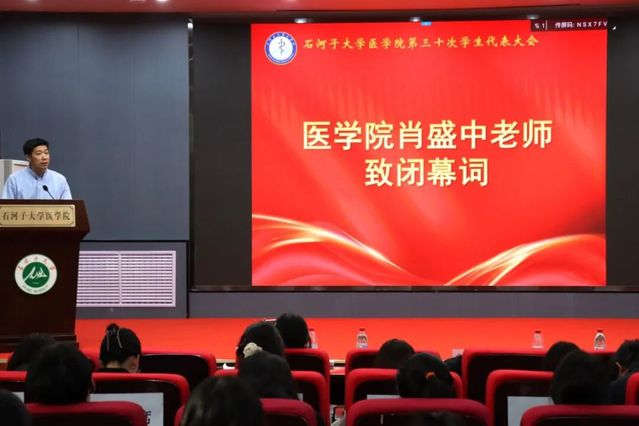 最后,医学院团委书记肖盛中老师致闭幕词。他对本次大会的圆满组织和丰硕成果给予了充分肯定,向新当选的学生会主席团和委员会成员表示热烈祝贺。肖盛中老师希望新一届学生会能够继承和发扬优良传统,牢记 “服务同学” 的根本宗旨,锐意改革创新,切实发挥好桥梁纽带作用,团结带领全院同学以昂扬向上的姿态、求真务实的作风,为学院的高质量发展和医学事业的进步贡献青春智慧与力量。