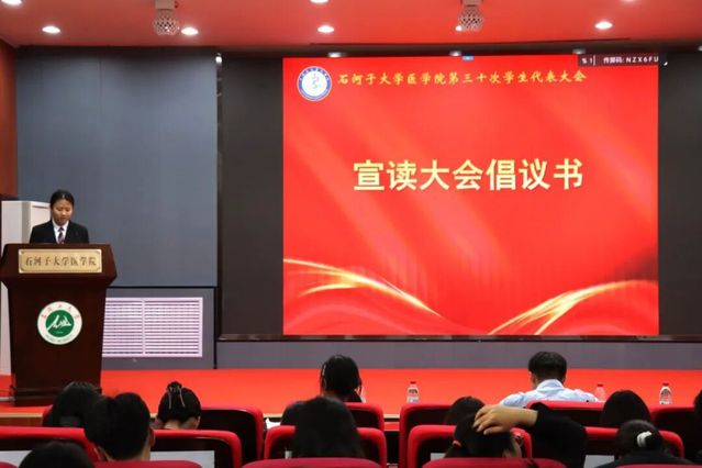 2025年12月14日,石河子大学医学院第三十次学生代表大会在南区学术报告厅隆重开幕。医学院副院长王良海、学生工作办公室主任朱伟娟、团委书记肖盛中、预防医学系辅导员王海楠、护理系辅导员刘蒙恩莅临指导。来自全院各专业、年级76名学生代表,肩负着全院青年学子的殷切重托,怀揣着对学生会发展的美好期盼汇聚一堂,共商发展大计,共绘青春蓝图。
