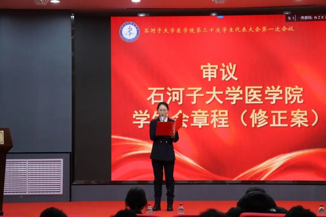 紧接着,第二十九届学生会办公室干事陈建真就《石河子大学医学院学生会章程(修正案)》作说明。学生会章程是学生会依法依章履行职能、开展工作的基本准则,此次修订进一步完善了组织运行机制,为促进学生会组织规范化、制度化建设奠定了坚实基础。