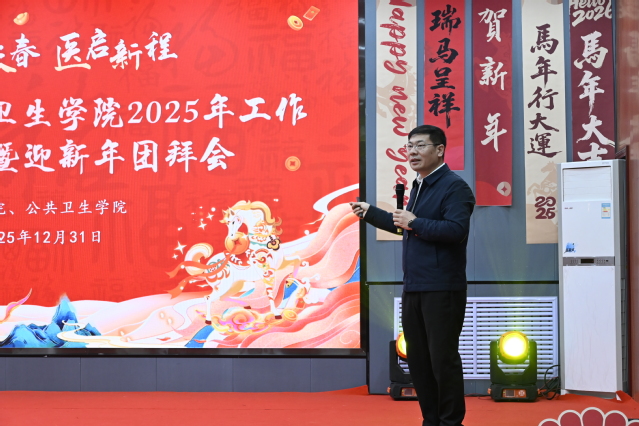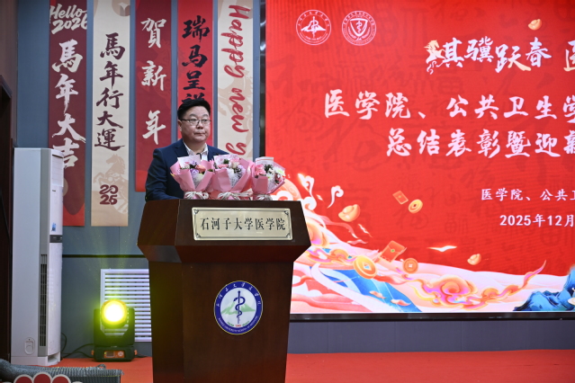 2025年12月31日下午,“骐骥跃春,医启新程”医学院、公共卫生学院2025年工作总结表彰暨迎新年团拜会在南区学术报告厅隆重举行。北京大学公共卫生学院副院长、石河子大学医学院、公共卫生学院特聘教授王海俊,石河子大学教务处处长李思源等医学导师、石河子大学第一附属医院(临床医学院)、石河子大学附属中医医院(兵团中医医院)、石河子大学医学院第三附属医院(第八师石河子市总医院)等附属单位领导嘉宾以及医学院、公共卫生学院领导班子成员和全体教职工齐聚一堂,共忆耕耘岁月,共话发展蓝图,共度辞旧迎新美好时刻。