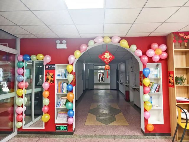 经过同学们的精心布置,宿舍楼大厅焕发出全新的节日光彩。大厅中央“福”字拉花与灯笼相映成趣,墙面装饰错落有致,特别是通道口处用彩色气球搭建起的拱门造型,五彩缤纷的气球与醒目的红色中国结相互映衬,整个空间洋溢着温馨喜庆的迎新氛围,为同学们构筑了一个充满仪式感的节日空间。
