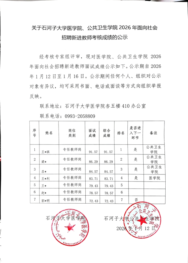 关于石河子大学医学院、公共卫生学院2026年面向社会招聘新进教师考核成绩的公示