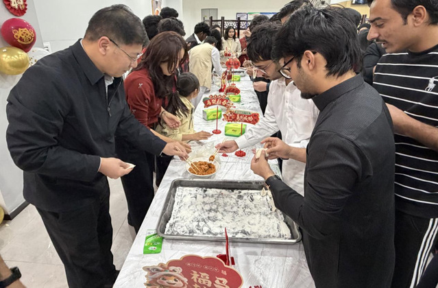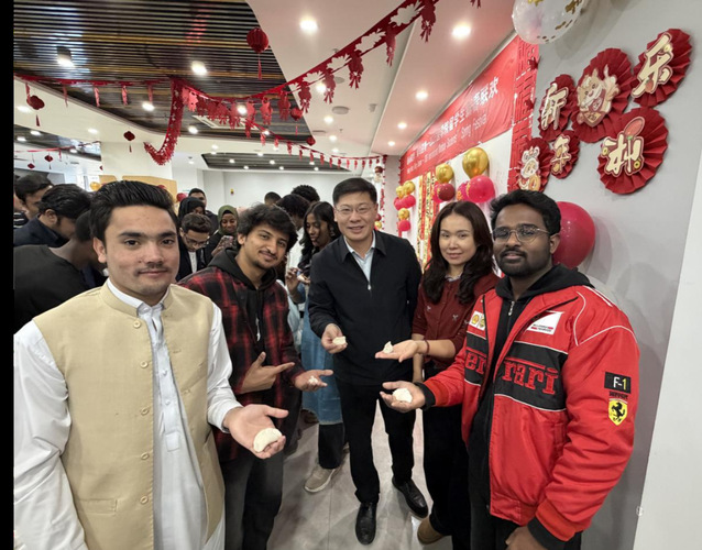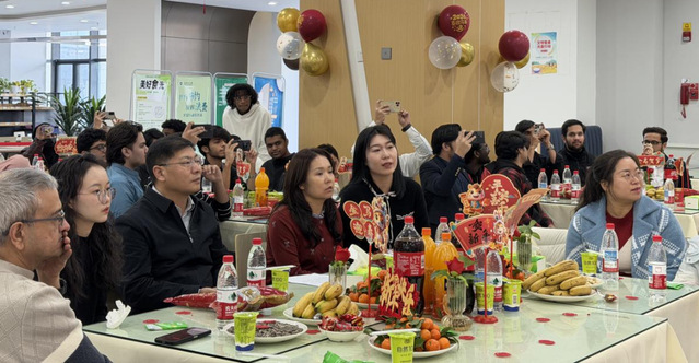 致辞结束后,包饺子活动率先温馨上线,为整场联欢会奠定了浓浓的烟火气与年味儿基调。老师们主动上手指导,耐心教留学生们擀皮、放馅、捏形,从笨拙摸索到逐渐熟练,大家互帮互助、其乐融融。来自不同国家的学子围坐在一起,指尖翻飞间,一个个形态各异的饺子新鲜出炉,虽模样参差不齐,却承载着大家对新春的期盼与对中国年俗的热爱。包饺子环节不仅让留学生们亲手体验了中国传统年俗,更在动手实践中感受了“团圆”的中国文化内涵,进一步拉近了师生间、学子间的距离。
