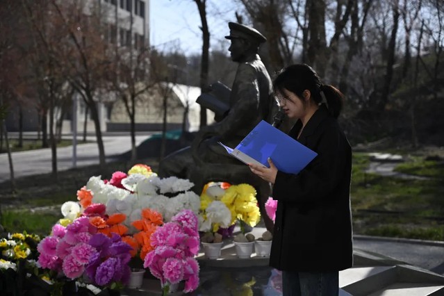 默哀毕,学生代表缓步走向潘世征将军雕像,敬献花篮,以庄重的仪式寄托对先烈的深切哀思与崇高敬意。