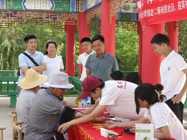 7月13日,石河子大学医学院赴第二师减“压”降“糖”,“慢”启医航基层服务实践团深入石河子市迎宾小区与文明小区,开展了一场温馨实用的血糖血压健康科普活动,将关怀与知识送到社区老人身边,以实际行动践行“到祖国最需要的地方去”的青春誓言。学院党委副书记雷建鹏、团委书记肖盛中、学生工作办公室副主任张娜来到实践现场,走访慰问实践团。