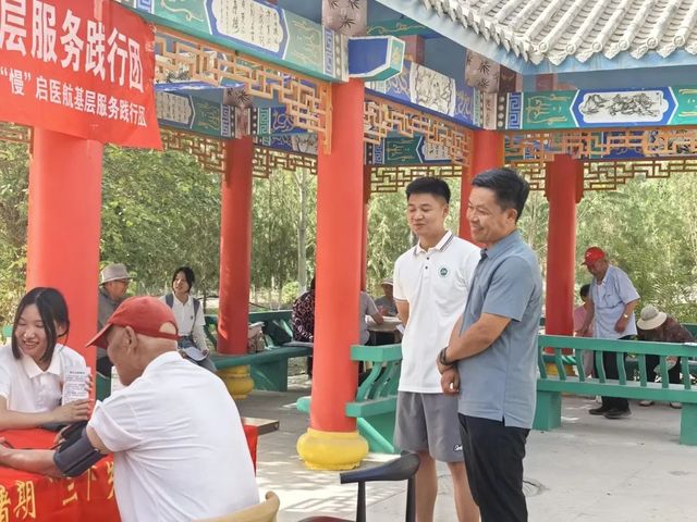 7月13日,石河子大学医学院赴第二师减“压”降“糖”,“慢”启医航基层服务实践团深入石河子市迎宾小区与文明小区,开展了一场温馨实用的血糖血压健康科普活动,将关怀与知识送到社区老人身边,以实际行动践行“到祖国最需要的地方去”的青春誓言。学院党委副书记雷建鹏、团委书记肖盛中、学生工作办公室副主任张娜来到实践现场,走访慰问实践团。