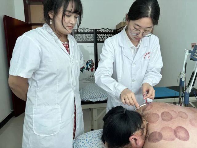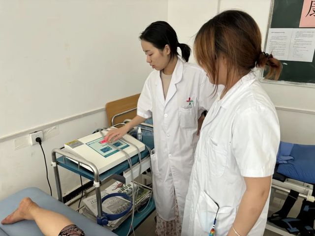 在老师指导下,队员们运用中频治疗仪,依据病人疼痛位置,细致调节透热、中频等强度参数,为患者电疗镇痛,在现代中医理疗实践里打磨技能。