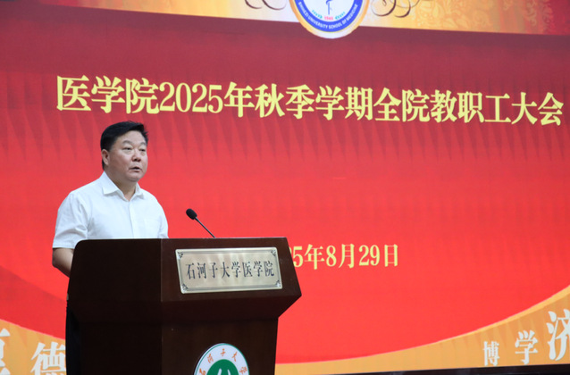 8月29日,医学院2025年秋季学期全院教职工大会在南区学术报告厅顺利召开。会议由党委副书记、院长马克涛主持,全体院领导班子成员参加会议。