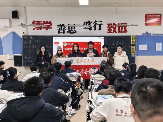 寒假归乡之际,为搭建高中与高校的沟通桥梁,向家乡学子传递石河子大学的办学风采与求学故事,石河子大学返乡宣讲成员先后走进济宁市第一中学、济宁市孔子高级中学,开展主题返校宣讲活动。以亲身经历为纽带,以青春心声为媒介,既回馈母校培育之恩,也为高三学子点亮升学方向,让石大声音传遍故里校园。